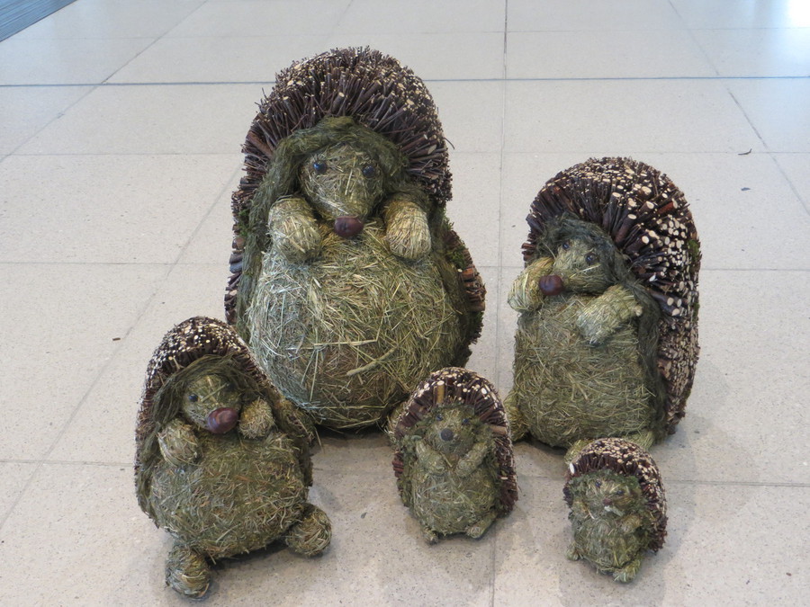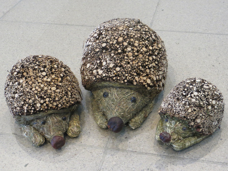 Igel aus Heu und Birkenästen aufrecht sitzend